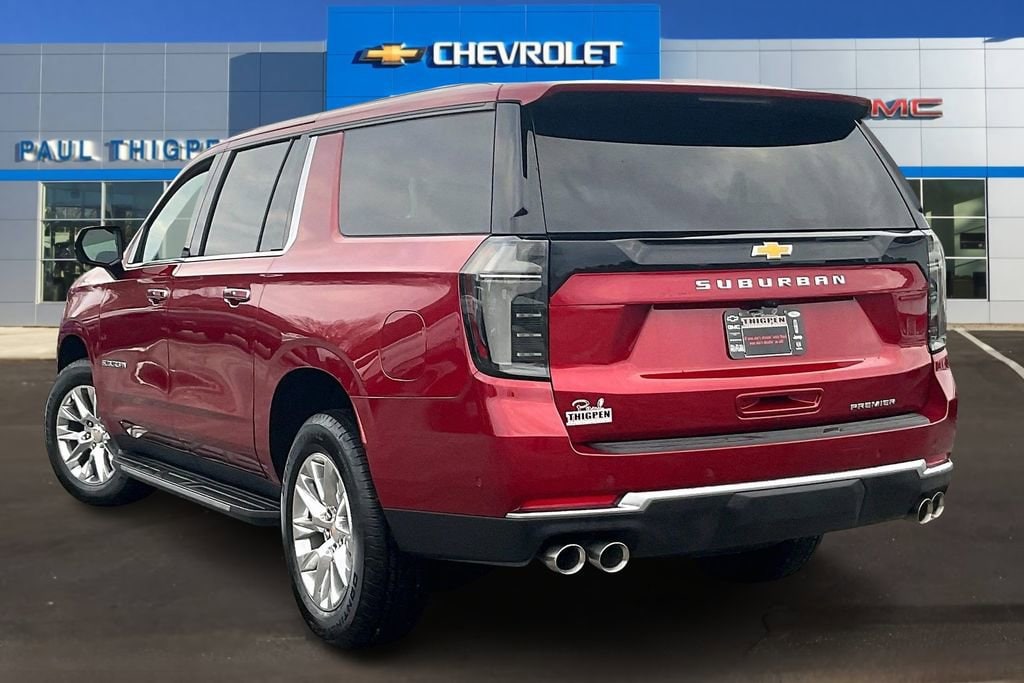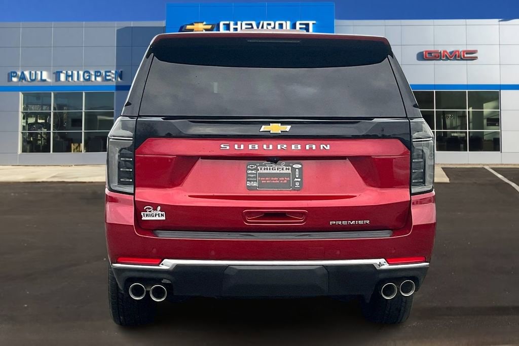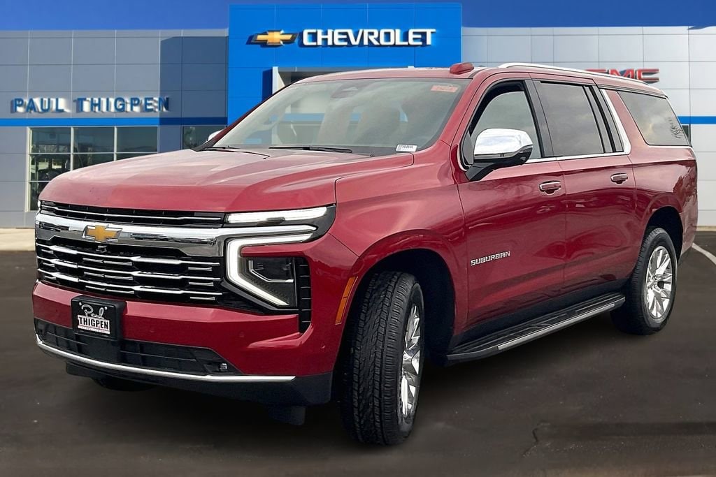 Radiant Red Tintcoat 2025 Chevrolet Suburban Premier EcoTec3 5.3L V8 4WD Advanced Trailering Package (Blind Zone Steering Assist with Trailering, Hitch View with Pan/Zoom Image Adjustment, and Smart Trailer Integration Indicator), License Plate Front Mounting Package, Max Trailering Package (2-Speed Active Electronic AutoTrac Transfer Case, Hill Descent Control, and Integrated Trailer Brake Controller), Preferred Equipment Group 1LZ (20 x 9 Polished Aluminum Wheels, 3rd Row 60/40 Power-Folding Split-Bench, 4-Way Power Driver Lumbar Seat Adjuster, 4-Way Power Front Passenger Lumbar Seat Adjuster, 8-Way Power Front Passenger Seat Adjuster, Auto-Dimming Inside Rear-View Mirror, Bose 10-Speaker Surround with CenterPoint, Bright Front and Rear Door Sill Plates, Chrome Door Handles with Body-Color Strip, Dual Exhaust System, Front LED Fog Lamps, Heated 2nd Row Outboard Seats, Heated Driver and Front Passenger Seats, Heated Power-Adjustable Outside Mirrors, Heated Steering Wheel, LED Headlamps with LED Daytime Running Lamps, LED Tail Lamps, Magnetic Ride Control Suspension, Memory Settings, Perforated Heated and Ventilated Seats, Power Release 2nd Row Bucket Seats, Power Tilt and Telescopic Steering Column, Power-Sliding Center Floor Console, Rear Power Liftgate, Universal Home Remote, and Wireless Phone Charging), Premium Liner Protection Package (3rd Row All-Weather Floor Liners, All-Weather Cargo Mat, and First and Second Rows Premium Floor Liners), Sun and Tow Package (Dual-Pane Power Panoramic Sunroof), 10 Speakers, 3.23 Rear Axle Ratio, 3rd row seats: split-bench, 4-Wheel Disc Brakes, 8-Way Power Driver Seat Adjuster, ABS brakes, Adaptive suspension, Air Conditioning, Alloy wheels, AM/FM radio: SiriusXM with 360L, Apple CarPlay/Android Auto, Auto High-beam Headlights, Auto-dimming door mirrors, Auto-dimming Rear-View mirror, Auto-leveling suspension, Automatic temperature control, Brake assist, Bumpers: body-color, Compass, Delay-off headlights, Driver door bin, Driver vanity mirror, Dual front impact airbags, Dual front side impact airbags, Electronic Stability Control, Emergency communication system: OnStar Services capable, Exterior Parking Camera Rear, Extra Capacity Cooling System, Four wheel independent suspension, Front anti-roll bar, Front Bucket Seats, Front Center Armrest, Front dual zone A/C, Front fog lights, Front reading lights, Fully automatic headlights, Garage door transmitter, Heated door mirrors, Heated front seats, Heated rear seats, Heated steering wheel, Illuminated entry, Low tire pressure warning, Memory seat, Navigation system: Google built-in compatibility (select service plan required, terms and limitations apply), Occupant sensing airbag, Outside temperature display, Overhead airbag, Overhead console, Panic alarm, Passenger door bin, Passenger vanity mirror, Perforated Leather Seating Surfaces, Power door mirrors, Power driver seat, Power Liftgate, Power passenger seat, Power steering, Power windows, Radio data system, Radio: 17.7 Diagonal Advanced Color LCD Display, Rain sensing wipers, Rear air conditioning, Rear anti-roll bar, Rear reading lights, Rear window defroster, Rear window wiper, Remote keyless entry, Security system, SiriusXM with 360L Trial Subscription, Speed control, Speed-sensing steering, Split folding rear seat, Spoiler, Steering wheel memory, Steering wheel mounted audio controls, Tachometer, Telescoping steering wheel, Tilt steering wheel, Traction control, Trip computer, Turn signal indicator mirrors, Variably intermittent wipers, Ventilated front seats, Voltmeter, and Wireless Apple CarPlay/Wireless Android Auto.