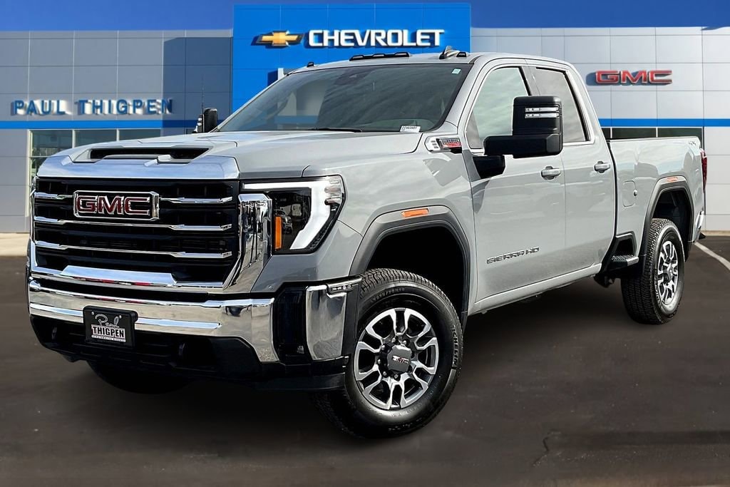 Thunderstorm Gray 2025 GMC Sierra 2500HD SLE Duramax 6.6L V8 Turbodiesel 4WD Gooseneck/5th Wheel Prep Package (Spray-On Pickup Bedliner w/GMC Logo), Preferred Equipment Group 3SA (120-Volt Bed Mounted Power Outlet, 120-Volt Instrument Panel Power Outlet, 2 Charge-Only Rear USB Ports, 2 Charge/Data USB Ports, 2-Speed Electronic Shift Transfer Case, 4-Way Manual Driver Seat Adjuster, Chrome Surround Grille w/Chrome Insert Bars, Deep-Tinted Glass, Keyless Open & Start, OnStar Services Capable, Push Button Start, SiriusXM w/360L Trial Subscription, Steering Wheel Audio Controls, and Wireless Phone Projection), Preferred Package (Adaptive Cruise Control, Hitch Guidance w/Hitch View, In-Vehicle Trailering System App, LED Cargo Area Lighting, Power Sliding Rear Window w/Defogger, and Universal Home Remote), Remote Start Package (Electric Rear-Window Defogger, Remote Vehicle Starter System, and Unauthorized Entry Theft-Deterrent System), SLE Convenience Package (10-Way Power Driver Seat Adjuster w/Lumbar, A/C w/Dual-Zone Automatic Climate Control, LED Fog Lamps, LED Smoked Amber Roof Marker Lamps, and Manual Tilt-Wheel/Telescoping Steering Column), SLE Heated Package (Heated Driver & Front Outboard Passenger Seats and Heated Steering Wheel), Suspension Package, 10-Speed Automatic, 4WD, Dark Walnut/Slate Cloth, 17 Machined Aluminum Wheels, 18 Machined Aluminum Wheels, 220-Amp Alternator, 4-Way Manual Passenger Seat Adjuster, 4-Wheel Disc Brakes, 6 Speakers, 6-Speaker Audio System Feature, ABS brakes, Air Conditioning, Alloy wheels, AM/FM radio: SiriusXM with 360L, Apple CarPlay/Android Auto, Auto High-beam Headlights, Auto-Dimming Inside Rear-View Mirror, Automatic Emergency Braking, Brake assist, Buckle to Drive, Bumpers: chrome, Cloth Seat Trim, Compass, Delay-off headlights, Driver door bin, Driver vanity mirror, Dual front impact airbags, Dual front side impact airbags, Electronic Stability Control, Emergency communication system: OnStar, Engine Block Heater, Exhaust Brake, Following Distance Indicator, Forward Collision Alert, Front 40/20/40 Split-Bench Seats, Front anti-roll bar, Front Center Armrest w/Storage, Front License Plate Kit, Front Pedestrian Braking, Front reading lights, Front wheel independent suspension, Fully automatic headlights, GMC MultiPro Tailgate, Heated door mirrors, Heavy-Duty 80 Amp Battery, Illuminated entry, IntelliBeam Automatic High Beam On/Off, Lane Departure Warning System, Low tire pressure warning, Occupant sensing airbag, Outside temperature display, Overhead airbag, Overhead console, Panic alarm, Passenger door bin, Passenger vanity mirror, Perimeter Lighting, Pickup Box, Power door mirrors, Power steering, Power windows, Power-Adjustable Black Outside Mirrors, Radio: AM/FM w/Premium GMC Infotainment System, Rear reading lights, Rear step bumper, Remote keyless entry, Speed control, Split folding rear seat, Steering wheel mounted audio controls, Tachometer, Tilt steering wheel, Traction control, Trip computer, Turn signal indicator mirrors, Variably intermittent wipers, Voltmeter, and Winter Grille Cover. 10-Speed Automatic, 4WD, Dark Walnut/Slate Cloth.