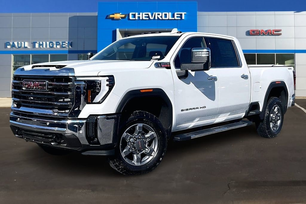 Summit White 2025 GMC Sierra 2500HD SLT Duramax 6.6L V8 Turbodiesel 4WD Gooseneck/5th Wheel Prep Package (Spray-On Pickup Bedliner w/GMC Logo), Preferred Equipment Group 4SA (120-Volt Bed Mounted Power Outlet, 120-Volt Instrument Panel Power Outlet, 2 Charge-Only Rear USB Ports, 2 Charge/Data USB Ports, 2-Speed Active Transfer Case, 6-Speaker Audio System Feature, Chrome Surround Grille w/Chrome Insert Bars, Deep-Tinted Glass, Electric Rear-Window Defogger, Front Rain-Sensing Wipers, Heated Driver & Front Outboard Passenger Seats, Keyless Open & Start, LED Cargo Area Lighting, Manual Tilt-Wheel/Telescoping Steering Column, OnStar Services Capable, Power Front Passenger Windows w/Express Up/Down, Push Button Start, Rear Wheelhouse Liners, Remote Vehicle Starter System, SiriusXM w/360L Trial Subscription, Steering Wheel Audio Controls, Unauthorized Entry Theft-Deterrent System, and Wireless Phone Projection), Sierra HD Pro Safety Plus Package (Bed View Camera w/2 Trailer Camera Provisions, HD Rear Vision Camera Delete, HD Surround Vision, Rear Cross Traffic Alert, Safety Alert Seat, Trailer Cam Provisions & Trailer Viewing Software, Trailer Side Blind Zone Alert, and Ultrasonic Front & Rear Park Assist), SLT Convenience Package (2 Charge/Data USB Ports Inside Center Console, Bose Premium 7-Speaker Sound System, Floor-Mounted Center Console, Front Bucket Seats, LED Smoked Amber Roof Marker Lamps, Ventilated Driver & Front Passenger Seats, and Wireless Charging), SLT Preferred Package (Adaptive Cruise Control, Heated 2nd Row Outboard Seats, Power Sliding Rear Window w/Defogger, and Universal Home Remote), Snow Plow Prep/Camper Package (220-Amp Alternator), Suspension Package, 10-Speed Automatic, 4WD, Black Leather, 10-Way Power Driver Seat Adjuster w/Lumbar, 10-Way Power Passenger Seat Adjuster w/Lumbar, 18 Machined Aluminum Wheels, 4-Wheel Disc Brakes, 6 Speakers, 6 Rectangular Chromed Tubular Assist Steps, ABS brakes, Air Conditioning, Alloy wheels, AM/FM radio: SiriusXM with 360L, Apple CarPlay/Android Auto, Auto High-beam Headlights, Auto-dimming door mirrors, Auto-dimming Rear-View mirror, Automatic Emergency Braking, Automatic temperature control, Brake assist, Buckle to Drive, Bumpers: chrome, Compass, Delay-off headlights, Driver door bin, Driver Memory, Driver vanity mirror, Dual front impact airbags, Dual front side impact airbags, Electronic Stability Control, Emergency communication system: OnStar, Engine Block Heater, Exhaust Brake, Following Distance Indicator, Forward Collision Alert, Front 40/20/40 Split-Bench Seats, Front anti-roll bar, Front Center Armrest w/Storage, Front dual zone A/C, Front fog lights, Front Pedestrian Braking, Front reading lights, Front wheel independent suspension, Fully automatic headlights, Heated door mirrors, Heated front seats, Heated steering wheel, Heavy-Duty 80 Amp Battery, Hitch Guidance w/Hitch View, Illuminated entry, In-Vehicle Trailering System App, IntelliBeam Automatic High Beam On/Off, Lane Departure Warning System, Low tire pressure warning, Memory seat, Occupant sensing airbag, Outside temperature display, Overhead airbag, Overhead console, Panic alarm, Passenger door bin, Passenger vanity mirror, Perf Leather-Appointed Front Outboard Seat Trim, Pickup Box, Power door mirrors, Power driver seat, Power passenger seat, Power steering, Power Sunroof, Power windows, Radio: AM/FM w/Premium GMC Infotainment System, Rain sensing wipers, Rear reading lights, Rear seat center armrest, Rear step bumper, Rear window defroster, Remote keyless entry, Security system, Speed control, Speed-sensing steering, Split folding rear seat, Steering wheel mounted audio controls, Tachometer, Telescoping steering wheel, Tilt steering wheel, Traction control, Trip computer, Turn signal indicator mirrors, Universal Vehicle Module, Variably intermittent wipers, Voltmeter, Wheels: 20 Bright Face w/Dark Painted Pockets, and Winter Grille Price includes: