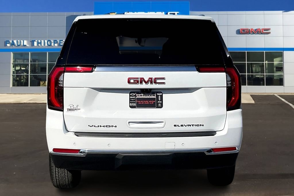 White 2026 GMC Yukon Elevation EcoTec3 5.3L V8 4WD 4WD, 10 Speakers, 3.23 Rear Axle Ratio, 3rd row seats: split-bench, 4-Wheel Disc Brakes, ABS brakes, Air Conditioning, Alloy wheels, AM/FM radio: SiriusXM with 360L, Apple CarPlay/Android Auto, Audio memory, Auto High-beam Headlights, Auto-dimming door mirrors, Auto-dimming Rear-View mirror, Automatic temperature control, Bodyside moldings, Bose 10-Speaker Surround with CenterPoint, Brake assist, Bumpers: body-color, Compass, CoreTech/Perforated Leather-Appointed Seating, Delay-off headlights, Driver door bin, Driver vanity mirror, Dual front impact airbags, Dual front side impact airbags, Electronic Stability Control, Emergency communication system: OnStar and GMC connected services capable, Exterior Parking Camera Rear, Four wheel independent suspension, Front anti-roll bar, Front Bucket Seats, Front Center Armrest, Front dual zone A/C, Front fog lights, Front reading lights, Fully automatic headlights, Garage door transmitter, Heated door mirrors, Heated Driver and Front Passenger Seats, Heated front seats, Heated rear seats, Heated steering wheel, Illuminated entry, Low tire pressure warning, Memory seat, Navigation system: GMC Connected Navigation, Occupant sensing airbag, Outside temperature display, Overhead airbag, Overhead console, Panic alarm, Passenger door bin, Passenger vanity mirror, Power door mirrors, Power driver seat, Power Liftgate, Power passenger seat, Power steering, Power windows, Premium Smooth Ride Suspension, Radio: 16.8 Diagonal Premium GMC Infotainment System, Rain sensing wipers, Rear air conditioning, Rear anti-roll bar, Rear reading lights, Rear seat center armrest, Rear window defroster, Rear window wiper, Remote keyless entry, Security system, SiriusXM with 360L, Speed control, Speed-sensing steering, Split folding rear seat, Spoiler, Steering wheel mounted audio controls, Tachometer, Telescoping steering wheel, Tilt steering wheel, Traction control, Trip computer, Turn signal indicator mirrors, Variably intermittent wipers, Voltmeter, and Wheels: 20 x 9 Machined and Painted. 4WD.