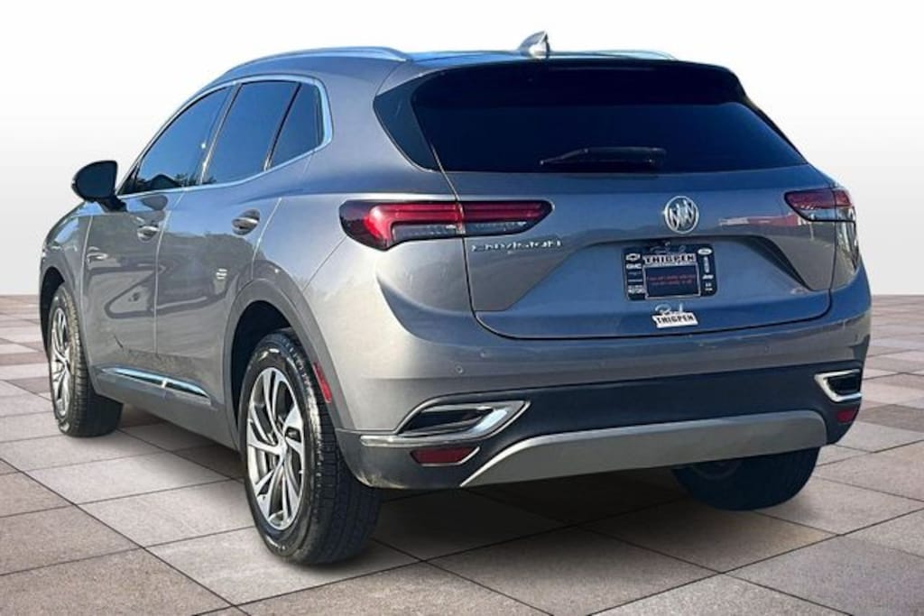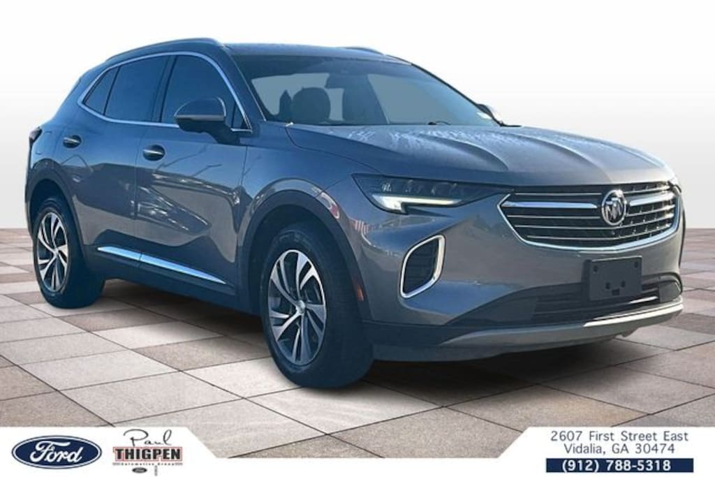 Vidalia Ford Lincoln 2607 E 1st St Vidalia, Georgia 30474 912-788-5318 Preferred Equipment Group 1SL, Technology Package I (3-Channel Programmable Universal Home Remote, Front & Rear Park Assist, HD Radio, HD Surround Vision, Head-Up Display, Memory Card Receptacle Audio System Feature, Radio: Buick Infotainment System AM/FM w/Nav, SiriusXM Radio, USB Charging-Only Ports, USB Ports, and Wireless Apple CarPlay/Wireless Android Auto), Ford Blue Advantage: Blue Certified Certified, 18" Machined Aluminum Wheels, 3.47 Final Drive Axle Ratio, 4-Wheel Disc Brakes, 7 Speakers, 7-Speaker Audio System Feature w/Amplifier, 8-Way Power Driver Seat Adjuster, ABS brakes, Air Conditioning, Alloy wheels, AM/FM radio: SiriusXM, Apple CarPlay/Android Auto, Auto High-beam Headlights, Auto-dimming door mirrors, Auto-dimming Rear-View mirror, Automatic temperature control, Brake assist, Bumpers: body-color, Compass, Delay-off headlights, Driver 4-Way Power Lumbar Seat Adjuster, Driver door bin, Driver vanity mirror, Dual front impact airbags, Dual front side impact airbags, Electronic Stability Control, Emergency communication system: OnStar and Buick connected services capable, Four wheel independent suspension, Front anti-roll bar, Front Bucket Seats, Front Center Armrest, Front dual zone A/C, Front Passenger 4-Way Power Lumbar Seat Adjuster, Front Passenger 8-Way Power Seat Adjuster, Front reading lights, Fully automatic headlights, Heated door mirrors, Heated Driver & Front Passenger Seats, Heated front seats, Heated steering wheel, Illuminated entry, Knee airbag, Leather Shift Knob, Low tire pressure warning, Memory seat, Occupant sensing airbag, Outside temperature display, Overhead airbag, Overhead console, Panic alarm, Passenger door bin, Passenger vanity mirror, Perforated Leather-Appointed Seat Trim, Power door mirrors, Power driver seat, Power Liftgate, Power passenger seat, Power steering, Power windows, Radio data system, Radio: Buick Infotainment System AM/FM Stereo, Rear anti-roll bar, Rear reading lights, Rear seat center armrest, Rear window defroster, Rear window wiper, Remote keyless entry, Roof rack: rails only, Security system, Speed control, Speed-sensing steering, Split folding rear seat, Spoiler, Steering wheel mounted audio controls, Tachometer, Telescoping steering wheel, Tilt steering wheel, Traction control, Trip computer, and Variably intermittent wipers. Satin Steel Metallic 2021 Buick Envision Essence FWD 2.0L Turbocharged 18" Machined Aluminum Wheels, 3-Channel Programmable Universal Home Remote, 3.47 Final Drive Axle Ratio, 4-Wheel Disc Brakes, 7 Speakers, 7-Speaker Audio System Feature w/Amplifier, 8-Way Power Driver Seat Adjuster, ABS brakes, Air Conditioning, Alloy wheels, AM/FM radio: SiriusXM, Apple CarPlay/Android Auto, Auto High-beam Headlights, Auto-dimming door mirrors, Auto-dimming Rear-View mirror, Automatic temperature control, Brake assist, Bumpers: body-color, Compass, Delay-off headlights, Driver 4-Way Power Lumbar Seat Adjuster, Driver door bin, Driver vanity mirror, Dual front impact airbags, Dual front side impact airbags, Electronic Stability Control, Emergency communication system: OnStar and Buick connected services capable, Four wheel independent suspension, Front & Rear Park Assist, Front anti-roll bar, Front Bucket Seats, Front Center Armrest, Front dual zone A/C, Front Passenger 4-Way Power Lumbar Seat Adjuster, Front Passenger 8-Way Power Seat Adjuster, Front reading lights, Fully automatic headlights, HD Radio, HD Surround Vision, Head-Up Display, Heated door mirrors, Heated Driver & Front Passenger Seats, Heated front seats, Heated steering wheel, Illuminated entry, Knee airbag, Leather Shift Knob, Low tire pressure warning, Memory Card Receptacle Audio System Feature, Memory seat, Occupant sensing airbag, Outside temperature display, Overhead airbag, Overhead console, Panic alarm, Passenger door bin, Passenger vanity mirror, Pe