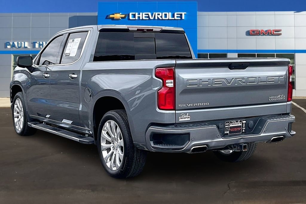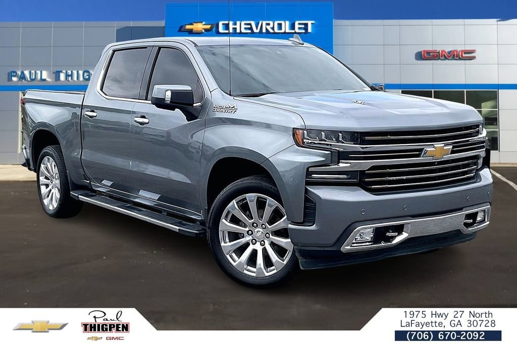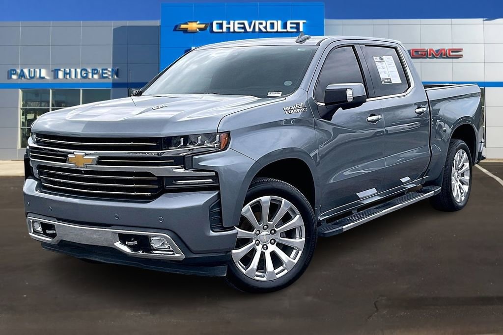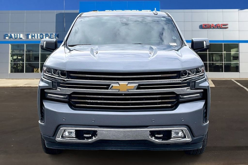 High Country Deluxe (All-Weather Floor Liner (LPO) and Power Sunroof), Preferred Equipment Group 3LZ (10-Way Power Driver Seat w/Lumbar, 10-Way Power Passenger Seat Adjuster w/Lumbar, 12-Volt Rear Auxiliary Power Outlet, 120-Volt Bed Mounted Power Outlet, 120-Volt Instrument Panel Power Outlet, 170 Amp Alternator, 2nd Row Heated Outboard Seats, 8 Driver Information Center, Advanced Trailering System, Auto-Dimming Inside Rear-View Mirror, Auxiliary External Transmission Oil Cooler, Bluetooth® For Phone, Chevrolet Connected Access, Chevrolet w/4G LTE, Chevytec Spray-On Black Bedliner, Chrome Assist Steps, Chrome Grille, Chrome Recovery Hooks, Color-Keyed Carpeting Floor Covering, Compass, Deep-Tinted Glass, Driver Memory, Dual Exhaust w/Polished Outlets, Electric Rear-Window Defogger, Electrical Lock Control Steering Column, Electronic Cruise Control, Floor Mounted Console, Front Carpeted Floor Mats, Front LED Fog Lamps, HD Radio, HD Rear Vision Camera, Heated Driver & Front Passenger Seats, Heated Steering Wheel, Heavy-Duty Rear Locking Differential, Hitch Guidance, Hitch Guidance w/Hitch View, Integrated Trailer Brake Controller, Keyless Open & Start, Lane Change Alert w/Side Blind Zone Alert, Leather Wrapped Steering Wheel, LED Cargo Area Lighting, Manual Tilt/Telescoping Steering Column, OnStar & Chevrolet Connected Services Capable, Outside Heated Power-Adjustable Mirrors, Painted Mirror Caps, Power Door Locks, Power Front Passenger Windows w/Express Up/Down, Power Front Windows w/Driver Express Up/Down, Power Rear Windows w/Express Down, Power Sliding Rear Window w/Rear Defogger, Rear Carpeted Floor Mats, Rear Cross Traffic Alert, Rear Dual USB Charging-Only Ports, Rear Wheelhouse Liners, Remote Vehicle Starter System, SiriusXM Radio, Steering Wheel Audio Controls, Theft Deterrent System (Unauthorized Entry), Trailer Tire Pressure Monitor System, Ultrasonic Front & Rear Park Assist, Universal Home Remote, Ventilated Driver & Front Passenger Seats, and Wireless Charging), Safety Package II (Following Distance Indicator, Forward Collision Alert, Front Pedestrian Braking, IntelliBeam Automatic High Beam On/Off, Lane Keep Assist w/Lane Departure Warning, Low Speed Forward Automatic Braking, and Safety Alert Seat), Technology Package (15 Diagonal Head-Up Display, HD Surround Vision, and Rear Camera Mirror), Trailering Package, Up-Level Rear Seat w/Storage Package, Silverado 1500 High Country, 4D Crew Cab, EcoTec3 6.2L V8, 10-Speed Automatic, 4WD, Satin Steel Metallic, Black Leather, 3.23 Rear Axle Ratio, 4-Wheel Disc Brakes, 7 Speakers, ABS brakes, Air Conditioning, Alloy wheels, AM/FM radio: SiriusXM, Apple CarPlay/Android Auto, Auto-dimming door mirrors, Auto-dimming Rear-View mirror, Automatic temperature control, Brake assist, Bumpers: body-color, Delay-off headlights, Driver door bin, Driver vanity mirror, Dual front impact airbags, Dual front side impact airbags, Electronic Stability Control, Front anti-roll bar, Front Bucket Seats, Front Center Armrest w/Storage, Front dual zone A/C, Front fog lights, Front reading lights, Front wheel independent suspension, Fully automatic headlights, Garage door transmitter, Heated door mirrors, Heated front seats, Heated rear seats, Heated steering wheel, Heavy Duty Suspension, Illuminated entry, Low tire pressure warning, Memory seat, Navigation System, Occupant sensing airbag, Outside temperature display, Overhead airbag, Overhead console, Panic alarm, Passenger door bin, Passenger vanity mirror, Perforated Leather Appointed Seat Trim, Power door mirrors, Power driver seat, Power passenger seat, Power steering, Power windows, Premium audio system: Chevrolet Infotainment System 3, Radio data system, Radio: Chevrolet Infotainment 3 Premium S
